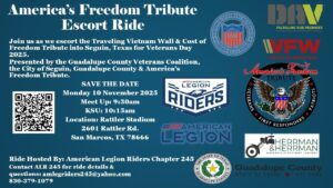 Join America’s Freedom Tribute Escort Ride on November 10, 2025 to accompany the Traveling Vietnam Wall and Cost of Freedom Tribute from San Marcos into Seguin.