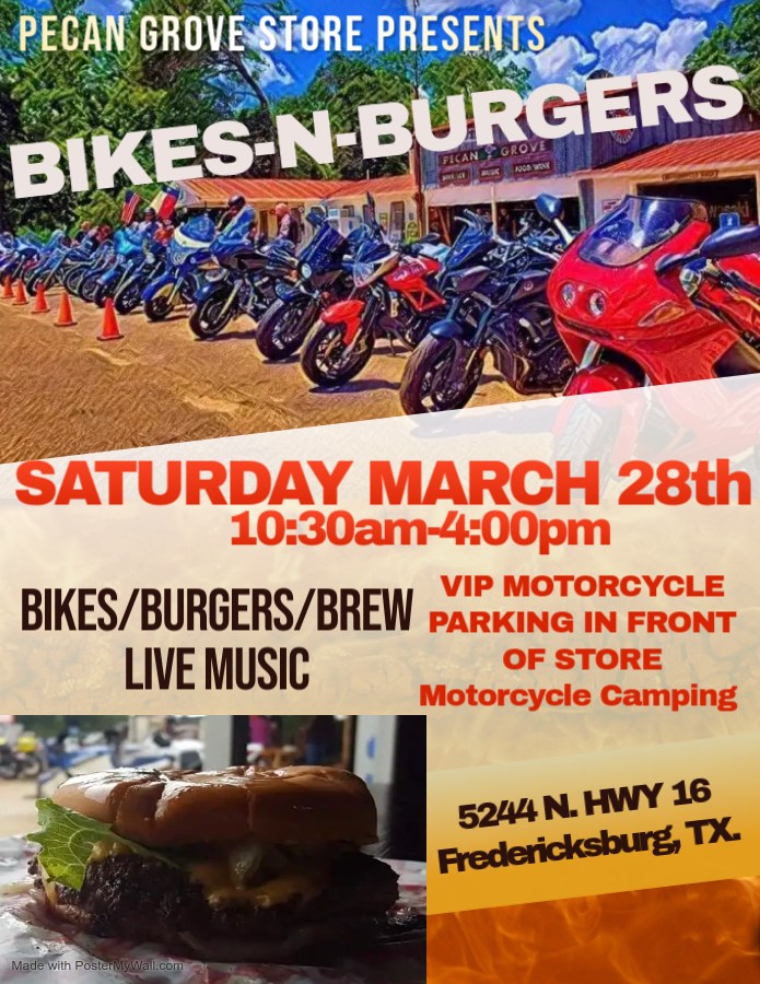 Join us for 6th Annual “Bikes -N- Burgers” at the Historic Pecan Grove Store is Saturday, March 28, 2026.