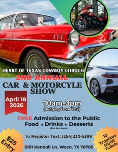 The Heart of Texas Cowboy Church hosts their second annual Car & Motorcycle Show on Saturday, April 18, 2026 in Waco.