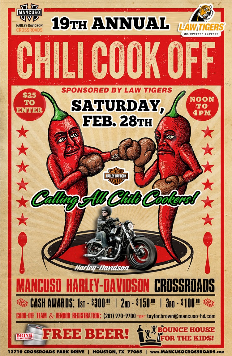 Mancuso H-D’s 19th annual Chili Cook-Off is Saturday, February 28, 2026.