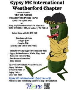 The Gypsy MC Weatherford Chapter invites you to join the fourth annual Pickle Party on April 17 to 19, 2026 in Granbury.