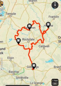 This will be a full-day adventure ride from Giddings through Thorndale, Cameron, Hearne, and back. About 75% of the time will be spent off-pavement.