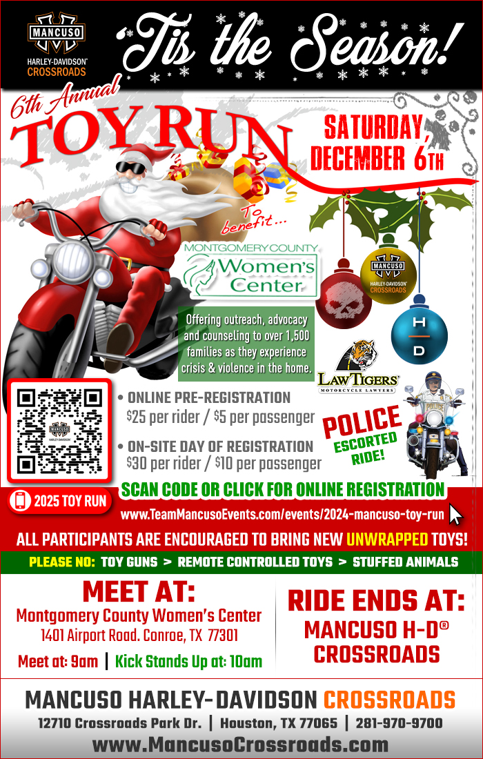 Don’t miss the 6th Annual Toy Run on Saturday, December 6, 2025, departing from the Montgomery County Women’s Center and riding to Mancuso Harley-Davidson Crossroads.