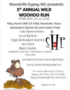 Woodville Gypsy MC hosts the fifth annual Wild WooHoo Run on February 20 to 22, 2026 in Woodville.