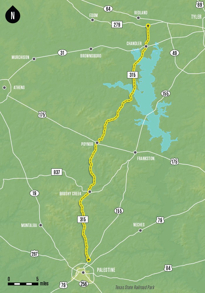 If you’re approaching the northern terminus of FM 315 via FM 279, it’s a good bet that you enjoyed a belt-stretching meal at The Shed in nearby Edom, another Ride Texas® favorite. The town of Chandler is a short four-mile ride down FM 315. This would be a good spot to stop for gas, if necessary. That will allow you to free your mind of such concerns as you continue down the highway.
