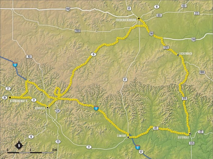 Heritage and history define the Fredericksburg-to-Kerrville ride. Ever since Baron Otfried Hans von Meusebach made peace with the Comanche and found a site 80 miles northwest of New Braunfels to accommodate more German settlers coming into the region, Fredericksburg has been a sought after destination. The towns around here celebrate their rich German heritage with annual events including Founders Day, Food & Wine Fest, Oktoberst, Kinderfest and more. Motorcycling events here include the Hill Country Run in May and the Harvest Classic Motorcycle Rally in October (both in Luckenbach), as well as the Johnson City Pig Roast, also in October. And don’t miss the Kerrville Folk Festival—18 days of fun and strummin’ starting Memorial Day weekend.