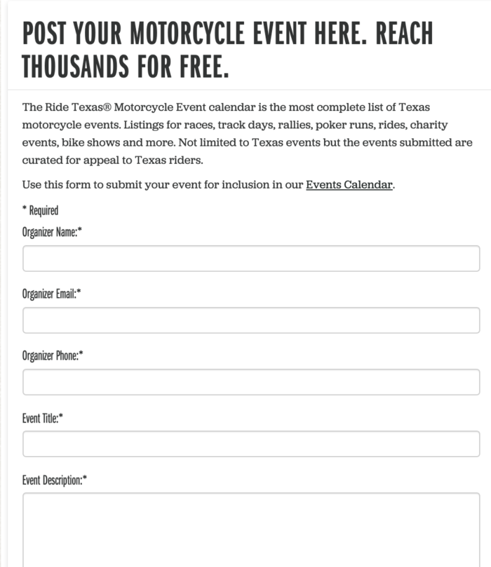 Share Facebook Twitter LinkedIn Pinterest Email Is your club or business having an event for motorcyclists? Get exposure for free by listing it on the RIDE TEXAS Event page. Click here to get started